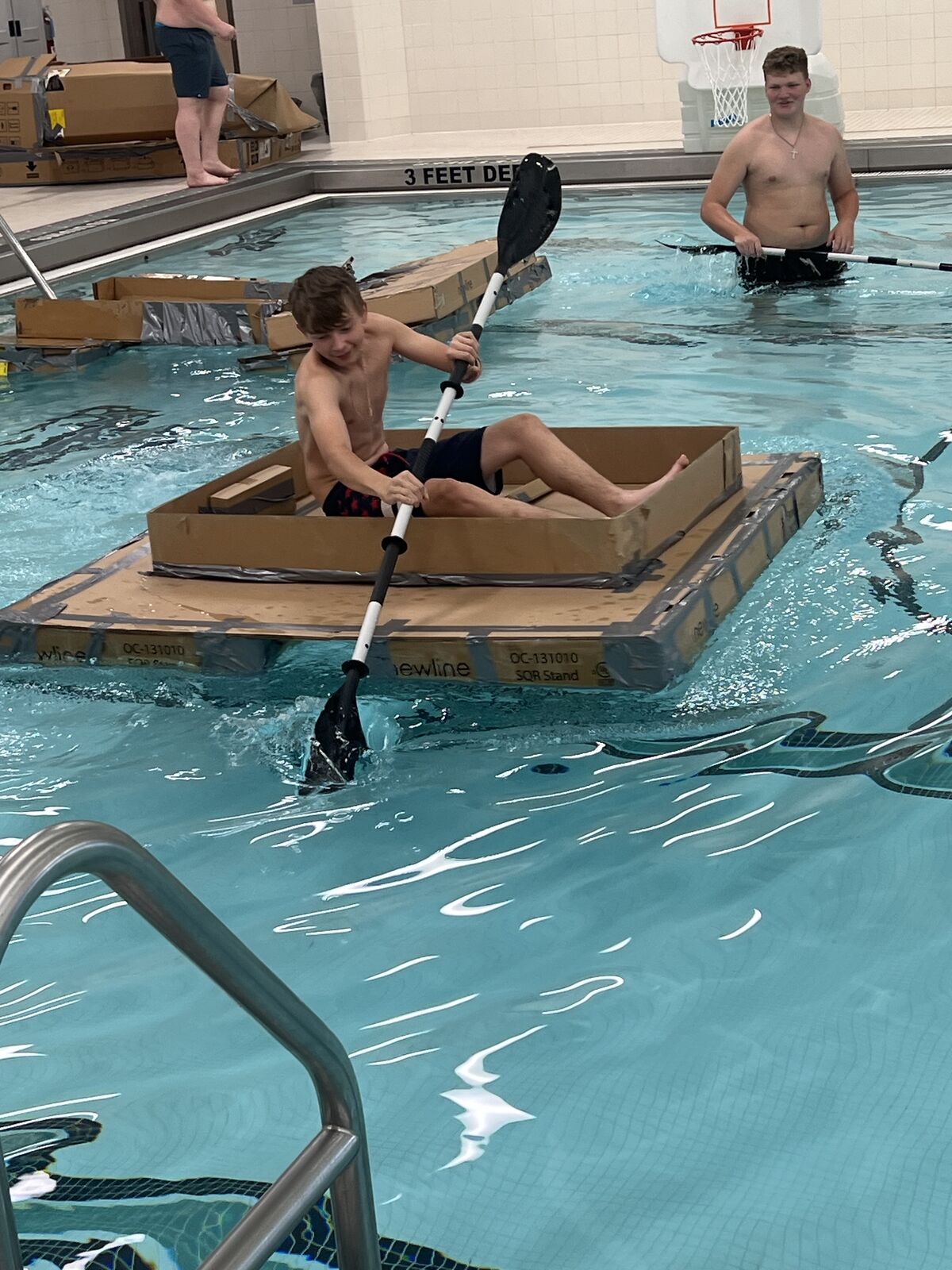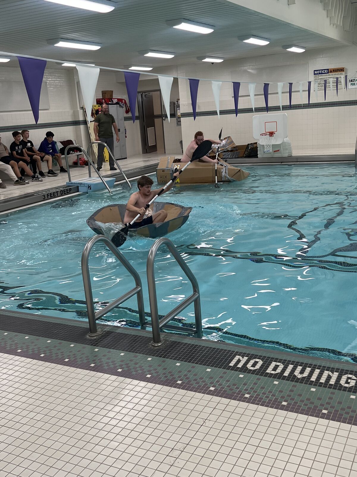 Principle of engineering students built four cardboard boats this year as part of their first unit with Mr. Habermehl. The top boat was Russell Errington, who built a boat similar to a "bull boat" made by Native Americans. Bull boats are built by stretching buffalo hides over a circular wooden frame. The class competition requires students to cross the pool and return back for a recorded time. Other students who were successful in traversing the pool include Brayden Chitwood and David Maciuba. #PantherPride