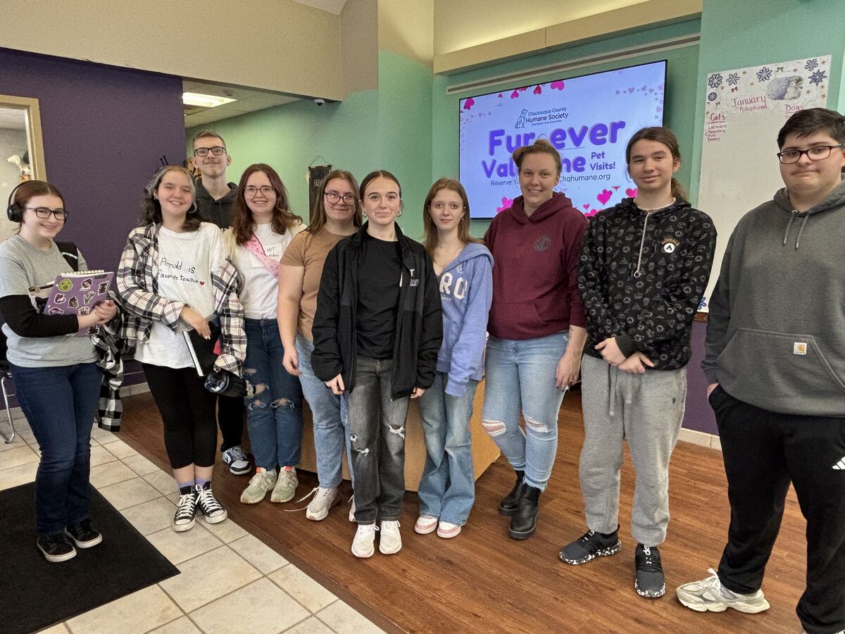 Members of the Class of 2027 recently visited the Chautauqua County Humane Society as part of their community service project. Students spent time socializing with adoptable cats, learning about each animal’s unique personality, and showing their creativity by drawing pictures and writing biographies to help showcase them to potential adopters.
